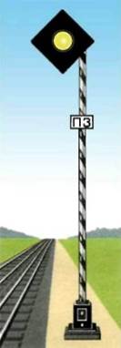 В необходимых случаях на входных и маршрутных светофорах может применяться сигнал: один зеленый мигающий огонь – разрешается поезду следовать на железнодорожную станцию по главному железнодорожному пути с установленной скоростью; следующий светофор (маршрутный или выходной) открыт и требует проследования его со скоростью не более 60 км/ч (рис. 14). На отдельных железнодорожных станциях в случаях, предусмотренных пунктом 66 приложения № 6 к Правилам, на входных и маршрутных светофорах может применяться сигнал: три желтых огня – разрешается локомотиву, мотор-вагонному поезду, мотовозу, дрезине следовать на свободный участок железнодорожного пути с особой осторожностью и со скоростью на железнодорожных путях общего пользования – не более 20 км/ч, а на железнодорожных путях необщего пользования – не более 15 км/ч, до маршрутного светофора с красным огнем (рис. 15).