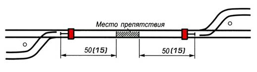 42. Всякое препятствие для движения по станционным железнодорожным путям и стрелочным переводам должно быть ограждено сигналами остановки независимо от того, ожидается поезд (маневровый состав) или нет. При ограждении на станционном железнодорожном пути места препятствия или производства работ сигналами остановки все ведущие к этому месту стрелки устанавливаются в такое положение, чтобы на него не мог выехать железнодорожный подвижной состав, и запираются или зашиваются костылями. На месте препятствия или производства работ на оси железнодорожного пути устанавливается переносной красный сигнал (рис. 98). Если какие-либо из этих стрелок направлены остряками в сторону места препятствия или производства работ и не дают возможности изолировать железнодорожный путь, такое место с обеих сторон ограждается переносными красными сигналами, устанавливаемыми на железнодорожных путях общего пользования на расстоянии 50 м, а на железнодорожных путях необщего пользования – 15 м от границ места препятствия или производства работ (рис. 99). В том случае, когда остряки стрелок на железнодорожных путях общего пользования расположены ближе чем на 50 м, а на железнодорожных путях необщего пользования – ближе чем на 15 м от места препятствия или производства работ, между остряками каждой такой стрелки устанавливается переносной красный сигнал (рис. 100).