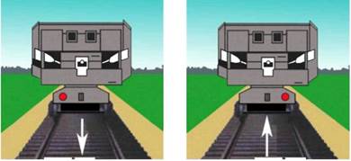 Рис. 188 Голова поезда при движении по неправильному железнодорожному пути обозначается: днем и ночью – красным огнем фонаря с левой стороны, с правой стороны – прозрачно-белым огнем фонаря (рис. 189).