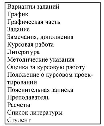 Рис. 2. Пул - список потенциальных сущностей Теперь из этого списка необходимо выделить сущности, остальные интерфейсные дуги будут преобразованы в атрибуты сущностей. В качестве сущностей выделим следующие: 1) задание; 2) пояснительная записка; 3) курсовая работа; 4) положение о курсовом проектировании; 5) студент; 6) преподаватель; 7) график; 8) методические указания. 5.2. Создание логической модели «сущность-связь» 1. Запустите MS Office Visio 2007. 2. На закладке выбора шаблона выберите категорию Программное обеспечение и базы данных и в ней элемент Схема модели базы данных. Нажмите кнопку Создать в правой части экрана. 3. Установите необходимые параметры страницы (масштаб, ориентация страницы). 4. MS Office Visio 2007 поддерживает различные нотации моделей баз данных. Для того чтобы задать нотацию IDEF1X, необходимо выбрать пункты меню База данных ^ Параметры ^ Документ. В открывшемся окне на вкладке Общие установить переключатель в меню Набор символов на IDEF1X. Меню Имена, видимые на схеме позволяет указать, какие имена атрибутов сущности будут отображены на диаграмме (концептуальные, физические или оба варианта одновременно). В данном случае для логического представления информационной модели необходимо выбрать пункт Концептуальные имена (рис. 5.2). В закладке Отношение окна Параметры документа базы данных в меню Показывать нужно отметить галочкой пункт Мощность, в меню Отображение вида выбрать пункт Показывать вербальную фразу, снять галочку в пункте Обратный текст (рис. 5.3). Данные настройки позволят отобразить имя и мощность связи в модели. 5. Для того чтобы создать сущность, необходимо перетащить элемент