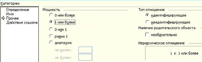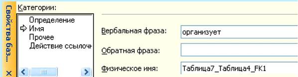 Примечание. Кроме того, при не идентифицирующем отношении нужно указать, является ли наличие родительской сущности обязательным (т.е. может ли существовать экземпляр дочерней сущности, если не существует экземпляра родительской). Если наличие родительского объекта является необязательным, графически это отобразится в виде не закрашенного ромба со стороны родительской сущности. Следующий шаг - в категории Имя в поле Вербальная фраза нужно указать имя отношения (рис. 5.6). Также можно указать имя связи в поле Обратная фраза для спецификации отношения потомок- родитель (в нашем случае обратная фраза отображаться не будет). Примечание. Все изменения при закрытии окна свойств сохраняются автоматически.