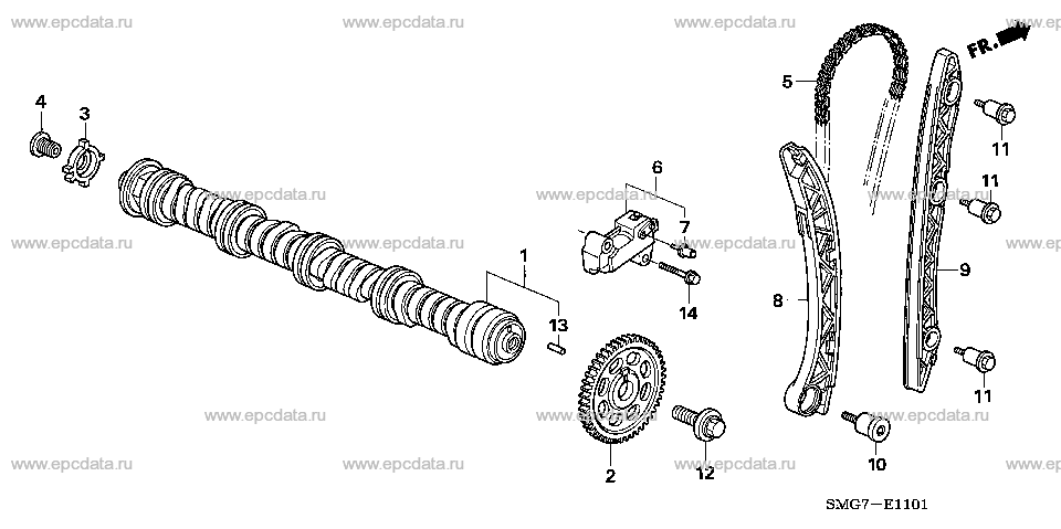 1. Распределительный вал (14110-RNL-H00) 2. Звездочка, распределительный механизм с цепным приводом (46Т) (14211-RNA-A01) 3. TDC PULSER пластина (14221-RNA-A01) 4. Болт TDC PULSER пластины (14222-PWA-004) 5. Цепь (136L) (14401-RNA-A01) 6. Комплект натяжителя, цепь привода распредвала (14510-RNA-A01) 7. Стопор (инструмент) (14511-PNA-003) 8. Комплект рычага, натяжитель цепи распределительного вала (14520-RNA-A01) 9. Направляющая, цепь привода распределительного вала (14530-RNA-A01) 10. Болт, шарнир натяжителя (90003-PNA-000) 11. Болт, направляющая цепи (90004-RNA-A00) 12. Болт-шайба 10*30 (90031-RNA-A01) 13. Шпонка 4.2*10.3 (90703-PNA-300) 14. Болт, фланец 6*30 (95701-06030-08)