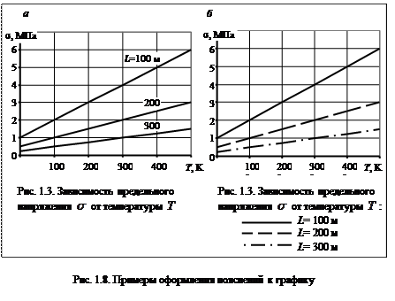 Наименования величин, значения которых откладываются на осях, указываются под осью абсцисс и левее оси ординат. Для размерных величин обязательно указывается единица измерения. Допускается заменять наименование величин буквенным обозначением (рис. 1.8), если обозначения расшифрованы в подписи под рисунком, например: «Зависимость предельного напряжения Если график содержит несколько кривых, то пояснения к графику могут быть нанесены как на сам график (рис. 1.8, а), так и при помощи разных типов линий (сплошной, штриховой, штрихпунктирной и пр.) и легенды (рис. 1.8, б). Все остальные пояснения или указания к графику должны быть внесены в подпись под рисунком.