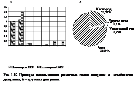 Диаграмма представляет собой чертеж, отображающий с помощью простейших фигур дискретные значения каких-либо сравниваемых показателей. В зависимости от формы этих фигур диаграммы могут быть столбиковыми (рис. 1.10, а) и круговыми (рис. 1.10, б). На диаграммах, в отличие от графиков, даются все надписи, позволяющие без чтения текста получить полную информацию о цифровых значениях и размерности исследуемых величин. Эти надписи должны быть как можно более краткими.