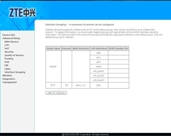 Далее распределяем услуги по портам, для этого переходим Advanced Setup -> InterfaceGrouping.