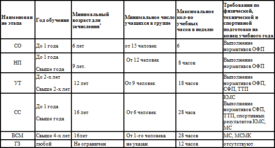 Таблица 2 Режимы учебно-тренировочной работы и требования по физической, технической и спортивной подготовке
