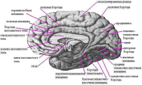 Полушария разделены продольной щелью, в глубине которой лежит пластинка белого вещества, состоящая из волокон, соединяющих два полушария, - мозолистое тело. Под мозолистым телом находится свод, представляющий собой два изогнутых волокнистых тяжа, которые в средней части соединены между собой, а спереди и сзади расходятся, образуя столбы и ножки свода. Спереди от столбов свода находится передняя спайка. Между передней частью мозолистого тела и сводом натянута тонкая вертикальная пластинка мозговой ткани - прозрачная перегородка. Полушарие образовано серым и белым веществом. В нем различают самую большую часть, покрытую бороздами и извилинами, - плащ, образованный лежащим по поверхности серым веществом - корой полушарий; обонятельный мозг и скопления серого вещества внутри полушарий - базальные ядра. Два последних отдела составляют наиболее старую в эволюционном развитии часть полушария. Полостями конечного мозга являются боковые желудочки. В каждом полушарии различают три поверхности: верхнебоковую (верхнелатеральную) выпуклую соответственно своду черепа, срединную (медиальную) - плоскую, обращенную к такой же поверхности другого полушария, и нижнюю - неправильной формы. Поверхность полушария имеет сложный рисунок, благодаря идущим в различных направлениях бороздам и валикам между ними - извилинам. Величина и форма борозд и извилин подвержены значительным индивидуальным колебаниям. Однако существует несколько постоянных борозд, которые ясно выражены у всех и раньше других появляются в процессе развития зародыша. Ими пользуются для разделения полушарий на большие участки, называемые долями. Каждое полушарие делят на пять долей: лобную, теменную, затылочную, височную и скрытую долю, или островок, расположенный в глубине боковой борозды. Границей между лобной и теменной долями является центральная борозда, между теменной и затылочной - теменно-затылочная. Височная доля отделена от остальных боковой бороздой. На верхнелатеральной поверхности полушария в лобной доле различают предцентральную борозду, отделяющую предцентральную извилину, и две лобные борозды: верхнюю и нижнюю, делящие остальную часть лобной доли на верхнюю, среднюю и нижнюю лобные извилины. В теменной доле проходит постцентральная борозда, отделяющая постцентральную извилину, и внутритеменная, делящая остальную часть теменной доли на верхнюю и нижнюю теменные дольки. В нижней дольке выделяют надкраевую и угловую извилины. В височной доле две параллельно идущие борозды - верхняя и нижняя височные - делят ее на верхнюю, среднюю и нижнюю височные извилины. В области затылочной доли наблюдаются поперечные затылочные борозды и извилины. На медиальной поверхности хорошо видны борозда мозолистого тела и поясная, между которыми находится поясная извилина. Над ней, окружая центральную борозду, лежит парацентральная долька. Между теменной и затылочной долями проходит теменно-затылочная борозда, а позади нее - шпорная борозда. Участок между ними называется клином, а лежащий впереди - преклиньем. В месте перехода на нижнюю (базальную) поверхность полушария лежит медиальная затылочно-височная, или язычная, извилина. На нижней поверхности, отделяя полушарие от ствола мозга, проходит глубокая борозда гиппокампа (борозда морского конька), кнаружи от которо