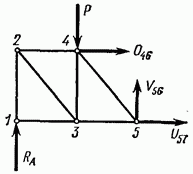 Усилие в стержне 3—2 было бы также равно нулю, если этот стержень и не был бы перпендикулярен стержням 1—3 и 3—5.