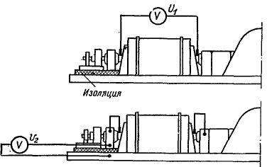 При этом измеряется напряжение U1 на концах вала и U2 между изолированным стулом и плитой. При замере напряжения U2 сопротивление изоляции масляных пленок на подшипнике со стороны турбины и на том подшипнике, на котором производится измерение, закорачивают, как показано на рис. 2.