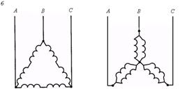 С уменьшением частоты f критический момент несколько уменьшается в области малых частот вращения. Это объясняется возрастанием влияния активного сопротивления обмотки статора при одновременном снижении частоты и напряжения. Частотное регулирование позволяет изменять частоту вращения в диапазоне (20...30): 1. Частотный способ является наиболее перспективным для регулирования АД с короткозамкнутым ротором. Потери мощности при таком регулировании невелики, поскольку минимальны потери скольжения. Ступенчатое регулирование скорости можно осуществить, используя специальные многоскоростные АД с короткозамкнутым ротором. Из выражения n0 = 60f/р следует, что при изменении числа пар полюсов р получаются механические характеристики с разной частотой вращения n0 магнитного поля статора. Так как значение р определяется целыми числами, то переход от одной характеристики к другой в процессе регулирования носит ступенчатый характер. Существует два способа изменения числа пар полюсов. В первом случае в пазы статора укладывают две обмотки с разным числом полюсов. При изменении скорости к сети подключается одна из обмоток. Во втором случае обмотку каждой фазы составляют из двух частей, которые соединяют параллельно или последовательно. При этом число пар полюсов изменяется в два раза. На рис. 6, а, б приведены схемы переключения с одинарной звезды на двойную и с треугольника на двойную звезду.