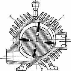 Рис. 1. Схема ротационного вакуум-насоса Ротационный вакуум-насос служит для создания в вакуум-проводе установки разрежения, необходимого для работы доильных аппаратов. В четырех пазах ротора 1 насоса (рис. 1) свободно движутся в радиальном направлении лопатки 2. Во время вращения ротора лопатки под действием центробежной силы прижимаются к внутренней поверхности цилиндра корпуса 3. Из-за эксцентричного расположения ротора в цилиндре лопатки то погружаются в пазы, то выходят из них, изменяя объем свободного пространства, ограниченный цилиндром, ротором и двумя соседними лопатками, который в зоне всасывающей камеры увеличивается, а в зоне выхлопной камеры уменьшается. Благодаря этому создается отсос воздуха из вакуум-провода. Производительность четырехлопастного ротационного вакуум-насоса