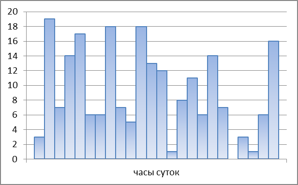 Гистограмма распределения числа вызовов, поступающих в течение суток по линиям спецсвязи «01» на ЦУКС гарнизона, представлена на рис. 1.2 (строиться на основании статистических данных табл. 1.1)