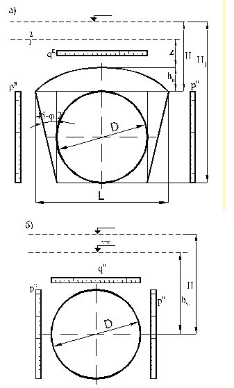 Рис. 4.1. Схемы к определению горного давления: а – по гипотезе сводообразования; б – от веса толщи грунтов над тоннелем Значения нормативных равномерно распределенных вертикальной q н и горизонтальной p н нагрузок от давления всей толщи грунтов над тоннелем определяют по следующим формулам: