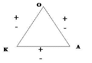 Знаки «+» або «–» означають ставлення комунікатора та адресата до об’єкта, і, якщо воно протилежне, виникає конфлікт, і це відображає незбалансованість трикутника.