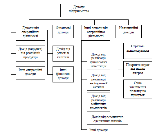 Рисунок 1.8 – Формування доходів підприємства [4] Інші операційні доходи включають інші доходи від операційної діяльності, крім доходу від реалізації продукції. До них відносяться: - доходи від реалізації іноземної валюти; - доходи від реалізації інших оборотних активів (крім фінансових інвестицій); - доходи від оперативної оренди активів; - доходи від операційної курсової різниці за операціями в іноземній валюті; - суми одержаних штрафів, пені, неустойок та інших санкцій за порушення господарських договорів; - доходи від списання кредиторської заборгованості; - відшкодування раніше списаних активів (надходження боргів, списаних як безнадійні); - суми одержаних грантів та субсидій; - інші доходи. Дохід від участі в капіталі відображає доходи, одержані від інвестицій в асоційовані, дочірні або спільні підприємства. Вони включають збільшення частки інвестора в чистих активах об’єкту інвестування (внаслідок одержання асоційованим, дочірнім та спільним підприємством прибутків або зростання їх власного капіталу). Інші фінансові доходи включають доходи, що виникають у ході проведення фінансової діяльності підприємства. До них відносяться: - дивіденди одержані; - відсотки одержані; - інші доходи від фінансових операцій. Надзвичайні доходи підприємства – це доходи, що одержуються в умовах надзвичайних подій (стихійного лиха, пожеж, техногенних аварій та ін.). Вони включають: - страхові відшкодування (надходження від страхових організацій); - покриття втрат від надзвичайних ситуацій з інших джерел; - суму зменшення податку на прибуток від звичайної діяльності внаслідок таких втрат.