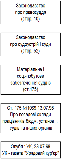 В кожному розділі пошук документа здійснюється у підрозділах та класах за ключовими словами. Прикладами бібліографічних покажчиків систематичного типу є різні літописи, що їх випускає Книжкова Палата України: “Літопис книг”, “Літопис газетних статей”, “Літопис авторефератів”, “Літопис дисертацій” тощо. В Російській Федерації видаються аналогічні “Летописи” Книжной Палаты. Інформація у “Літописах” та “Летописях” упорядкована за галузями, наприклад: · Економіка. Економічні науки · Право. Юридичні науки · Філологічні науки · Мовознавство “Літописи” мають також алфавітний покажчик, який дозволяє швидко визначити наявність робіт конкретного автора за певний період. В предметних виданнях бібліографічні описи первинних документів розміщуються за предметними рубриками спеціально складеного рубрикатора. Наприклад, предметний покажчик (рубрикатор) до “Каталогу нормативних документів” відносить документи, в яких використовується термін “інформація”, до розділів 01.040.01 (Загальні положення. Термінологія. Стандартизація. Документація) та 01.140.20 (Інформатика), а термін “кодування інформації” – до розділів 01.040.01, 01.140.30, 01.040.35, 01.080.10, 03.100, 35.040, 35.240.60. Чітко структурованими є періодичні журнали-довідники, наприклад, ”Покажчик нормативних правових актів України” (щомісячний юридичний журнал-довідник). Нормативні акти в ньому можна знайти за такими ознаками: · галузь законодавства · хронологія · ключові слова · органи влади та управління · статус акта (новий; змінений; акт, що втратив чинність; акт, дію якого зупинено або продовжено). Акти в Покажчику пов’язані між собою єдиною ознакою – порядковим номером статті, який наведено у реєстрі нормативних актів. Приклад пошуку інформації про стан матеріального і соціально-побутового забезпечення суддів (за допомогою ”Покажчика нормативних правових актів України”, №8, 1998):