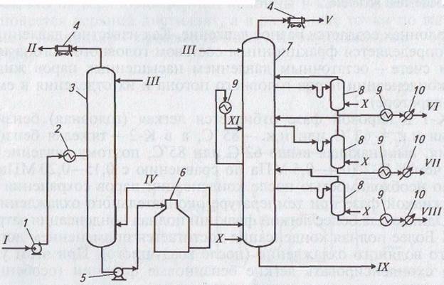 Описание схемы производства В конце 40-х годов установки АВТ имели производительность 500— 600 тыс. т/год. Вскоре эти мощности оказались недостаточными для удовлетворения растущей потребности в массовых нефтепродуктах. С 1950 г. ускоренными темпами начали строить установки АВТ, работающие по схеме двукратного испарения, мощностью 1, 1, 5 и 2 млн. т/год. Схема такой промышленной установки мощностью 2 млн. т/год приводится на рис. 1.