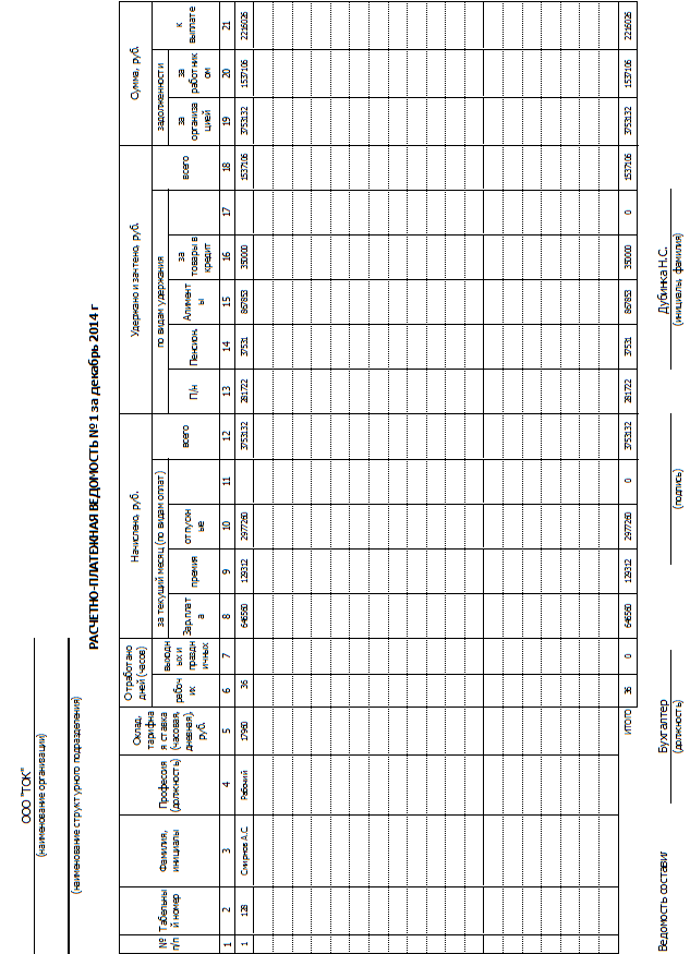 Задача № 1. 1. Произведите начисление заработной платы и удержания из заработной платы работнику, уходящему в отпуск на 30 календарных дней. 2. Составьте корреспонденции счетов по начислениям и удержаниям из заработной платы. 3. Обобщите полученные данные в расчетно-платежной ведомости. Данные для решения: Часовая тарифная ставка, руб. - 17960 Фактически отработано часов за текущий месяц - 36 Начисление премии, (%) - 20 Начисления за 12 предшествующих месяцев, руб.: повременная заработная плата - 27300000 премия из ФЗП - 7860000 материальная помощь - 250000 по больничному листу (100%) - 210000 Работник уходит в отпуск со следующего числа: с 8 декабря Количество детей, на которых платятся алименты - 1 Удержание за товары в кредит, руб. - 350000