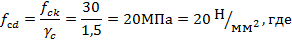 Задача 33. Определить площадь сечения продольной растянутой арматуры Аs1 класса S400 для железобетонной балки прямоугольного сечения размерами: b=30см, h=60см, с=5 см. Бетон класса С30/37. Расчётный изгибающий момент МSd=420 кН•м. 1.Определить расчётные данные: 2.Определить рабочую высоту сечения 3.Определить значения ξ, η, ξ lim. 4.Определить площадь рабочей продольной арматуры Аs1. Решение: 1. Определяю расчётное сопротивление бетона класса С30/37 осевому сжатию: