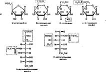 По физико-химическим свойствам углеводы делят на нейтральные, содержащие только гидроксильНые и карбонильные группы; основные, включающие кроме названных аминогруппу (аминосахара); кислые, содержащие кроме гидроксильных и карбонильных групп карбоксильные группы. I, Моносахариды Моносахариды, или монозы, — это простейшие углеводы. В названии всех моносахаридов имеется окончание -оза. Групповое наименование моносахаридов складывается из числа углеродных атомов и наличия соответствующей карбонильной группы — альдегидной или кетонной. Например, моносахариды, имеющие пять углеродных атомов, называют пентозами, а с учетом альдегидной группы — альдопептозами; если же они содержат кето- группу, то кетопентозами. Углеводы с шестью углеродными атомами называют соответственно альдогексозами и кетогексозами. Разные моносахариды принадлежат- к соединениям L- или D-ряда в зависимости бт L- или D-конфигурации заместителей у асимметрического атома углерода данного моносахарида, который дальше всего.отстоит от карбонильной группы. Например, у гексоз это С-5.' В водном растворе моносахариды существуют в виде или развернутой цепи, или циклической структуры. Циклические моносахариды отсутствуют у триоз и тетроз, но, начиная с пентоз, происходит самопроизвольная реакция между одной из гидроксильных групп и карбонильной группой с образованием цикла. Так образуются, например, пятичленные (фураноз- ные) и шестичленные (пиранозные) циклы. Гидроксил у первого углеродного атома циклического моносахарида называют полуацетальным. От него зависят восстанавливающие свойства углеводов. Производные моносахаридов. Модификация имеющихся групп или введение новых заместителей в молекулу дает различные производные моносахаридов. Они используются для построения разнообразных' полимерных углеводов. Некоторые из производных являются промежуточными продуктами обмена. Ниже приведены некоторые представители производных моносахаридов: