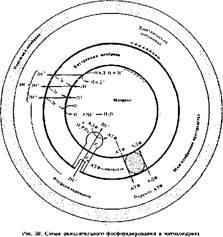 ма С|. Транспорт водорода на внешнюю сторону мембраны н окисление KoQ • Н2 на этом участке осуществляется в ходе так называемого Q-цикла, детали которого еще не ясны. Водород в составе KoQ • Н2 переносится с внутренней стороны на внешнюю с помощью специальных Q-белков. На внешней поверхности окисление KoQ • Н2 сопровождается переходом второй пары протонов в среду и возвращением (вторая электронная петля) двух электронов через цитохром Ьш и железосерный белок-2 (FeS-ПР,..) к другой молекуле KoQ, которая при восстановлении захватывает еще два протона из ма- трнкса. Третий перекрест начинается, когда KoQ • Н2 вновь переносит водород наружу, где окисляется, освобождая третью пару протонов. Два электрона от KoQ • Н2 через цитохромы с, и с передаются с внешней стороны на цитохромы а и as (цитохромоксидазу), которые расположены поперек мембраны, — третья электронная петля. Цнтохромоксидаза — единственный из переносчиков дыхательной цепи, связывающий 02. На цитохроме а3, обращенном к матриксу, происходит восстановление кислорода по уравнению 2е- + 7s02 + 2Н+ — Н, 0 или 4е~ +02-МН+— 2НаО Ионы Н+ для образования гидроксильных ионов и молекулы воды берутся из матрнкса митохондрий. Окисление НАД • На, начавшись на внутренней поверхности, заканчивается после трехкратного пересечения мембраны протонами и электронами восстановлением кислорода и образованием воды тоже на внутренней поверхности • внутренней мембраны митохондрий. Источником шести Н" *", освобождающихся снаружи митохондрий, служат два Н+ от субстратов окисления (находящихся в составе НАД • Нг)к четыре Н+ из среды матрикса. Источниками электронов, использующимися для восстановления кислорода, являются