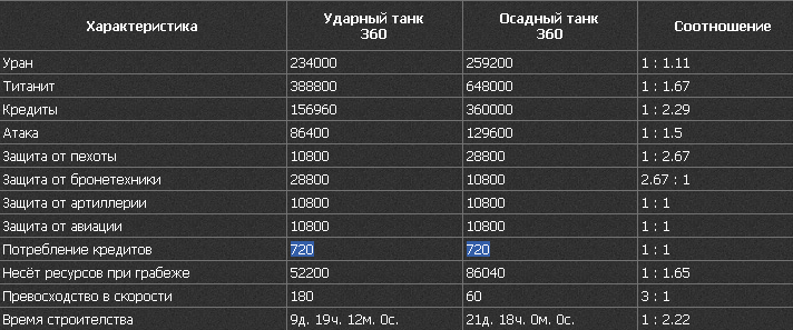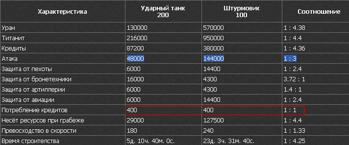 1. Бронетехника: Уд. Танк – Осадный танк В первом случае подобрали их соотношение по количеству потребляемых кредитов (Не стоит забывать, что оно одинаково за 1 единицу 2 кр) и получили: · На постройку ос. Танков нужно больше ресурсов (в случае титана на половину); · Атака в ударных танков наполовину меньше; · Потребление кредитов одинаково (по определению!); · Время строительства осадных танков в 2 раза больше.