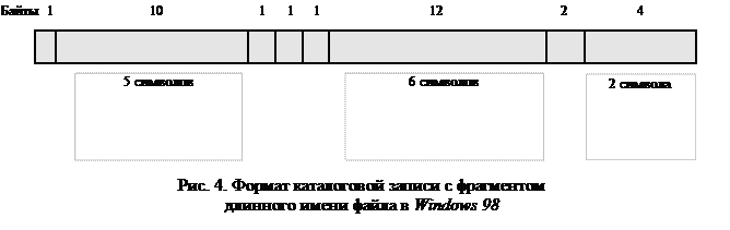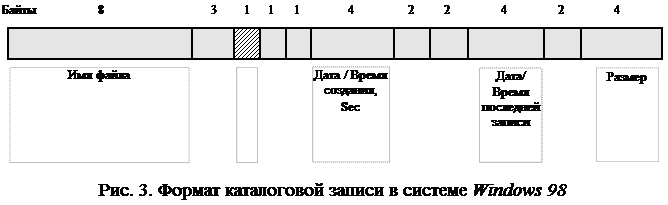 Первая версия операционной системы Windows 95 использовала файловую систему MS-DOS, с именами файлов из 8 + 3 символов и системами FAT-12 и FAT-16. Во второй версии Windows 95 были разрешены длинные имена файлов в новой файловой системе FAT-32, разработанной для поддержки дисков размером более 8 Гбайт и дисковых разделов больше 2 Гбайт. В операционных системах Windows 98 использовалась также файловая система FAT-32. В Windows 98 была разработана новая система поддержки длинных имен, обладавшая обратной совместимостью со старой системой имен 8 + 3, применявшейся в MS-DOS. Структура каталогов представляла собой список 32-байтовых описателей, формат которых был заимствован у файловой системы СР/М (написанной для процессора Intel 8080). Однако в 32-байтовом описателе файла оставались незадействованными 10 байт (рис.1), которые стали использоваться в FAT-32 (рис.3.)