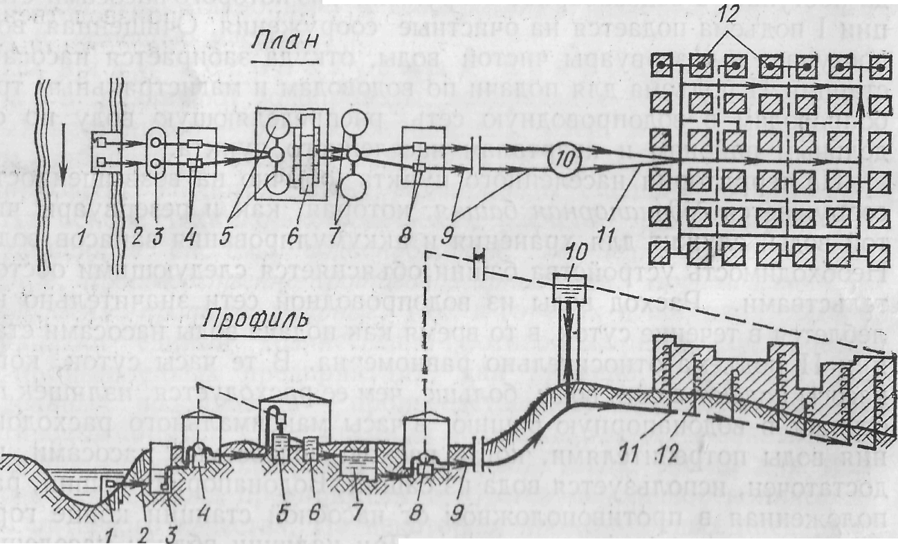 Рис. II.1. Схема водоснабжения насел-енного пункта 1 — водоприемник; 2 — самотечная труба; 3 — береговой колодец: 4 — насосы станции I подъема; 5 — отстойники; в — фильтры; 7 —-запасные резервуары чистой воды; 8 — насосы станции II подъема; 9 — водоводы; 10 — водонапорная башня; // — магистральные трубопроводы; 12 — распределительные трубопроводы