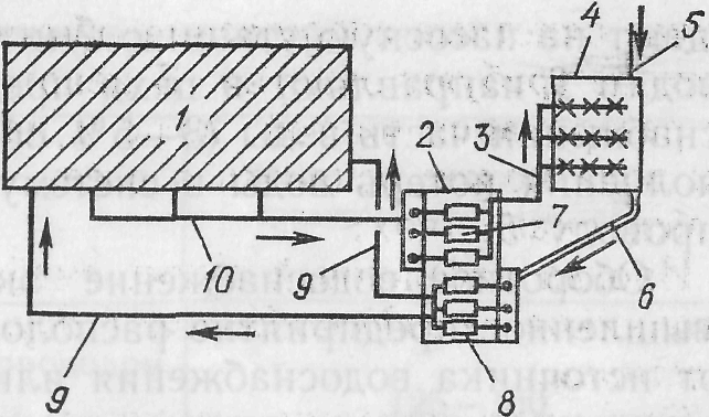 Рис. II.3. Схема оборотного водоснабжения промышленного предприятия Нередко для производственных целей требуется подача воды различного качества и под разными напорами. В этом случае устраивают две или несколько самостоятельных сетей. Воду, использованную в технологическом процессе, удаляют в канализационную сеть и после соответствующей очистки сбрасывают в водоем ниже по течению относительно объекта водоснабжения. На ряде промышленных предприятий (химические, нефтеперерабатывающие, металлургические заводы, ТЭЦ и пр.) воду применяют для целей охлаждения и она почти не загрязняется, а только нагревается. Такую производственную воду, как правило, используют вновь, предварительно охладив ее. На рис. II.З приведена схема оборотного водоснабжения промышленного предприятия. Нагревшуюся воду по самотечному трубопроводу 10 подают к насосной станции 2, откуда насосами 7 перекачивают по трубопроводу 3 на специальные сооружения 4, предназначенные для охлаждения воды (брызгальные бассейны или градирни). Охлажденную воду по самотечному трубопроводу 6 возвращают на насосную станцию 2 и насосами 8 по напорным трубопроводам 9 направляют в цехи предприятия /. При оборотном водоснабжении часть воды (3—5% общего расхода) теряется. Для восполнения потерь воды в систему подают «свежую» воду по трубопроводу 5. Оборотное водоснабжение экономически выгодно, когда промышленное предприятие расположено на значительном расстоянии от источника водоснабжения или на значительном возвышении по отношению к нему, так как в этих случаях при прямоточном водоснабжении будут велики затраты электроэнергии на подачу воды. Также выгодно устраивать оборотное водоснабжение, если расход воды в водоеме мал, а потребности в производственной воде велики. Схему водоснабжения с последовательным (или повторным) использованием воды применяют в тех случаях, когда воду, сбрасываемую после одного технологического цикла, можно использовать во втором, а иногда и в третьем технологическом цикле промышленного предприятия. Воду, использованную в нескольких циклах, удаляют затем в канализационную сеть. Применение такой схемы водоснабжения экономически целесообразно, когда необходимо сократить расход «свежей» воды.
