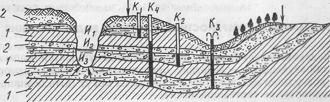 К подземным источникам водоснабжения относятся подземные воды, образующиеся вследствие просачивания в землю атмосферных и поверхностных вод. Подземные воды могут быть безнапорными и напорными (артезианскими). Безнапорные воды заполняют водоносные горизонты неполностью и имеют свободную поверхность. Примером безнапорных вод может служить вода в водоносных горизонтах, вскрытых колодцами K1 и К2 (рис. II.6). Вода устанавливается в этих колодцах на уровнях, совпадающих с уровнями подземных вод. Безнапорные подземные воды первого от поверхности водоносного горизонта (слой, вскрытый колодцем Ki на рис. II.6) называются грунтовыми. Грунтовые воды характеризуются повышенной загрязненностью, поэтому при использовании для целей водоснабжения их в большинстве случаев подвергают очистке. Напорные (артезианские) воды заполняют водоносные горизонты полностью. Примером напорных вод может служить вода в водоносном горизонте, вскрытом колодцами К3 и K 4 (см. рис. II.6). Артезианские воды, как правило, характеризуются высоким качеством и в большинстве случаев могут использоваться для хозяйственно-питьевых целей без очистки. В колодце, вскрывающем напорный водоносный горизонт, вода поднимается до пьезометрической линии. Если пьезометрическая линия проходит выше поверхности земли, наблюдается излив воды из колодца (колодец К3 на Рис- II.6). Такие колодцы называют самоизливающимися. Уровень воды, устанавливающийся в колодце при отсутствии водоразбора, называют статическим. Статический уровень безнапорных вод совпадает с уровнем подземных вод, а напорных вод — с пьезометрической линией (рис. II.7). При откачке воды из колодца уровень ее снижается, причем тем больше, чем интенсивнее откачка. Такой уровень называют динамическим. Уровни воды и пьезометрические линии, устанавливающиеся вокруг колодцев при откачке из них воды (в поперечном разрезе они имеют выпуклую кверху форму), называют кривыми депрессии. Область, ограниченную кривыми депрессии, называют депрессионной воронкой. Безнапорные и напорные воды могут выходить на дневную поверхность (родники). Выход безнапорных вод называют нисходящим ключом, а выход напорных вод — восходящим ключом. Ключевая вода отличается высоким качеством и также может использоваться для целей водоснабжения без очистки. К поверхностным источникам водоснабжения относятся реки, водохранилища и озера. Для промышленных целей может использоваться и морская вода. При отсутствии в приморских районах пресной воды морская вода после опреснения может использоваться и для хозяйственно-питьевых целей. Однако это должно быть обосновано технико-экономическими соображениями.