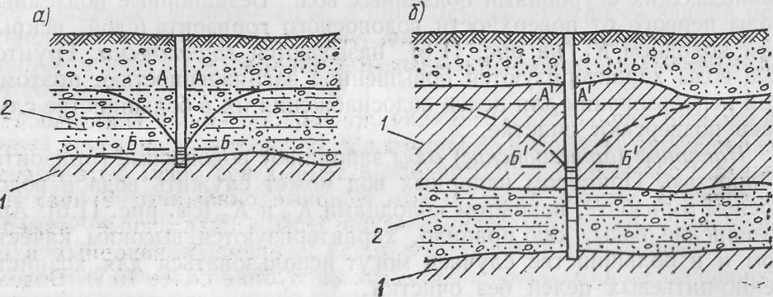 Рис. II.6. Схема образования и залегания подземных вод 1 — водоупорные породы; 2 — водоносные породы; К1 — Kt — колодцы; K2 — Kз — источники (родники) Рис. II.7. Депрессионные воронки а — безнапорных вод; б — напорных вод; 1 — водоупорные породы; 2 — водоносные породы; А А — статический уровень; А’ А’ — пьезометрическая линия при отсутствии откачки; ББ и Б’Б’ — динамические уровни/