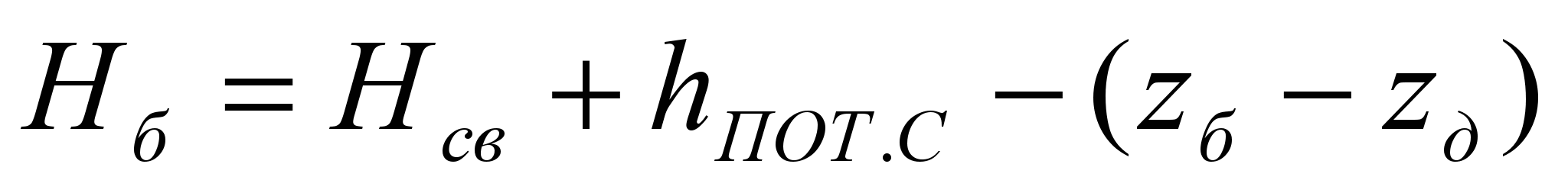 где Hсв — свободный напор в диктующей точке; hПот.с — сумма потерь напора в сети; zд и zб — отметки поверхности земли в диктующей точке и в месте расположения водонапорной башни. Рис. II.27. Схемы определения высоты водонапорной башни и напора насосов а — водонапорная башня в начале сети; б — водонапорная башня в конце сети (контррезервуар) Напор насосов определяют по формуле (см. рис. II.27) где Hбака — высота бака (слоя воды в баке) водонапорной башни; hПОТ.В — сумма потерь напора в водоводе (при расположении башни в конце сети h пот.в — сумма потерь напора в водоводе и в сети); hпот.вс — сумма потерь напора во всасывающей трубе; Z0 — отметка самого низкого уровня воды в водоеме.