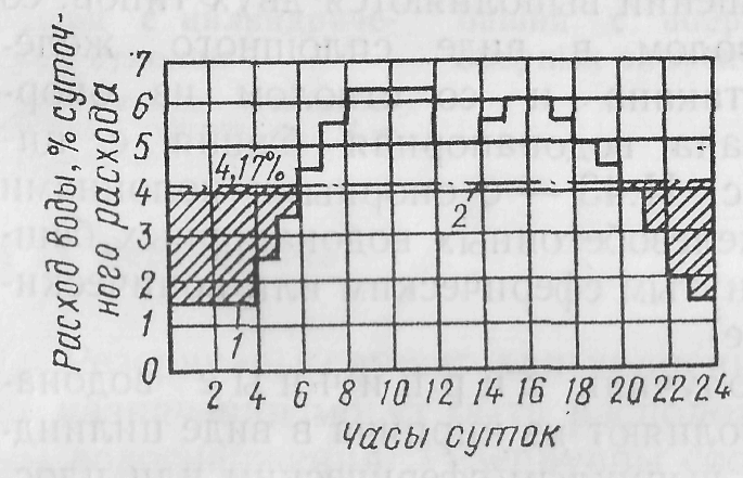 Полного соответствия водопотребления и подачи воды насосной станцией II подъема добиться невозможно. Для регулирования подачи и потребления служат водонапорные башни. Регулирующий объем бака водонапорной башни можно определять по совмещенным ступенчатым или интегральным графикам подачи и потребления воды. В первом случае он равен площади фигур, заключенных между линиями подачи воды и водопотребления. Например, на графике рис. II.39 регулирующий объем бака равен площади заштрихованных фигур. Во втором случае регулирующий объем бака равен сумме асболютных величин максимальной положительной и максимальной отрицательной разностей ординат кривых подачи и потребления воды. Рис. II.39. Ступенчатый график подачи и потребления воды I — водопотребление; 2 — подача насосами На интегральном графике рис. II.40 он равен 13, 02 + + 6, 14 = 19, 16% среднесуточного расхода. Рис. II.40. Интегральный график подачи и потребления воды / — водопотребление; 2 — подача насосами Рис. II.41. Схема оборудования водонапорной башни трубопроводами Для слива воды в случае переполнения бака служит переливная труба 9, заканчивающаяся в верхней части воронкой 6. К переливной трубе присоединена грязевая труба 7 с задвижкой 8, предназначенная для периодического удаления скапливающегося на дне бака осадка, а также для отвода воды при промывке бака. Водонапорный бак оборудуют уровнемером с сигнализацией на насосную станцию II подъема. Для возможности осмотра бака снаружи и внутри его устанавливают лестницы. Размеры ствола башни в плане определяются размерами опорной части бака. Расстояние между стенками шатра и бака должно составлять около 0, 7 м. Водонапорные башни бывают железобетонные, кирпичные, металлические и деревянные. Железобетонные водонапорные башни в конструктивном отношении выполняются двух типов: со стволом в виде сплошного железобетонного цилиндрического стакана и со стволом из опорных колонн. На рис. II.42 показана водонапорная башня с цилиндрическим стволом, а на рис. II.43 — с опорными колоннами из сборных элементов. Баки в железобетонных водонапорных башнях также железобетонные с вогнутым сферическим или конически-сферическим днищем (бак Интце). Широкое распространение получили кирпичные водонапорные башни. Ствол башен выполняют из кирпича в виде цилиндра или многогранника, а баки с выпуклым сферическим или плоским днищем — из стали. В сельских водопроводах получили распространение также м е-таллические водонапорные башни системы А. А. Рожнов-ского (рис. II.44). Деревянные башни выполняют преимущественно на временных водопроводах. Роль водонапорных башен могут выполнять пневматические на-порно-регулирующие установки. Однако из-за больших эксплуатационных затрат их применяют редко. Рис. II.42. Железобетонная водонапорная башня с цилиндрическим стволом