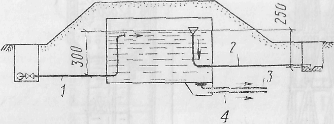 Резервуары служат для хранения запасов воды и в зависимости от назначения могут быть расположены в различных местах системы водоснабжения. Резервуары сооружают преимущественно в следующих целях. а) прием и хранение воды, поступающей от насосных станций I подъема, фильтровальных станций или районных водопроводов и подаваемой далее насосными станциями II (или последующего) подъема; б) прием «свежей» воды, питающей системы оборотного водоснабжения; в) хранение регулирующего объема воды и поддержание напора в сети (водонапорный резервуар); г) хранение противопожарных и аварийных запасов воды. Объем резервуаров зависит от их назначения и производительности системы водоснабжения. Так, объем водонапорных резервуаров для хранения регулирующего объема воды, устраиваемых вместо водонапорных башен в тех случаях, когда имеется значительное естественное возвышение, определяется так же, как объем баков водонапорных башен. Объем резервуаров чистой воды при фильтро-иальных станциях обусловливается регулирующим объемом Ур, необходимым для возмещения разницы между равномерной подачей воды фильтровальной станцией и откачкой ее насосами станции II подъема. Регулирующий объем резервуара Vp определяют по совмещенному ступенчатому или интегральному графику подачи воды фильтровальной станцией и откачки ее насосами II подъема. В резервуарах чистой воды обычно хранится также запас воды Уф для технологических целей очистной станции (промывки фильтров и др.) и запас воды Vn для целей пожаротушения. Таким образом, общий объем резервуара должен равняться: V=VP+VФ+VП (II.31) VП=3QU+SQX— 3Q1 (11.32) где -Qх — расход воды на хозяйственно-питьевые нужды за 3 ч' наибольше-1 о иодонотреОления (по графику). Рис. II.45. Схема оборудования резервуара чистой воды трубопроводами Рис. II.46. Железобетонный резервуар объемом 1000 м3, выполняемый в мокрых грунтах / — днище на утрамбованном грунте, гидроизоляция битумом, бетонная подготовка; 2 — стенка, 3 — люк с лазом: 4 — вентиляционные трубы; 5 — перекрытие; 6 — гидроизоляция битумом; 7 — грязевая труба; S — приямок Резервуары выполняют преимущественно из железобетона. При объеме до 2000 м3 железобетонные резервуары сооружают круглой формы в плане (рис. II.46), а при большем объеме — прямоугольной формы в плане. Перекрытие цилиндрических резервуаров устраивают плоским безбалочным, а прямоугольных резервуаров — плоским безбалочным или балочным. Железобетонные резервуары могут выполняться монолитными или сборными из отдельных элементов. Для обеспечения водонепроницаемости резервуаров их стенки и днище следует торкретировать, а внутренние поверхности стенок, кроме того, железнить. Кирпичные и каменные резервуары в настоящее время сооружаю! редко.