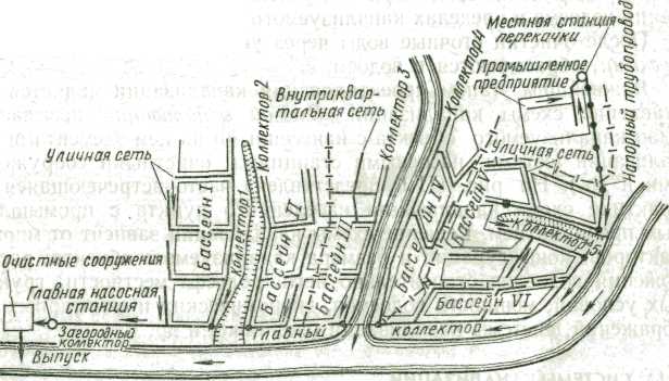 Канализация состоит из следующих основных элементов: внутренних канализационных устройств зданий, наружной внутриквартальной канализационной сети, наружной уличной канализационной сети, насосных станций и напорных трубопроводов, очистных сооружений и устройств для выпуска очищенных сточных вод в водоем. Внутренние канализационные устройства зданий, а также наружная внутриквартальная канализационная сеть рассмотрены в разделе IV данного учебника. Наружная уличная канализационная сеть представляет собой систему подземных трубопроводов, принимающих сточные воды от внутриквартальных сетей и транспортирующих их к насосным станциям, очистным сооружениям и в водоем (см. далее рис. III.1). В зависимости от характера обслуживаемой территории городские уличные сети принимают сточные воды от внутриквартальных или от заводских сетей, прокладываемых на территории промышленного предприятия для приема сточных вод из цехов и зданий внутри предприятия. В некоторых случаях заводские сети присоединяют к специальной сети промышленной канализации. Канализационные сети строят преимущественно самотечными. Для этого их прокладывают соответственно рельефу местности, разделяя всю канализуемую территорию населенного пункта на бассейны канализования. Бассейном канализования называют часть территории, ограниченную водоразделами. Участки канализационной сети, собирающие сточные воды с одного или нескольких бассейнов канализования, называют коллекторами. Коллекторы крупных размеров часто называют каналами. Коллекторы подразделяют на следующие виды: 1) коллекторы бассейнов канализования, собирающие сточные воды с отдельных бассейнов; 2) главные коллекторы, принимающие и транспортирующие сточные воды двух или более коллекторов бассейнов канализования; 3) загородные коллекторы, отводящие сточные воды транзитом (без присоединений) за пределы: объекта канализования к насосным станциям, очистным сооружениям или к месту их выпуска в водоем.