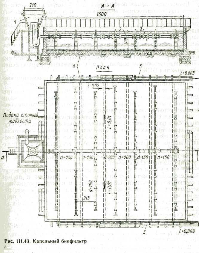 Биологические фильтры относятся к сооружениям биологической очистки сточных вод в искусственно созданных условиях. По производительности биофильтры подразделяют на капельные и высоконагружаемые. По способу подачи воздуха различают биофильтры с естественной и искусственной вентиляцией. Для капельных биофильтров используют естественную вентиляцию, для высоконагружаемых — как естественную, так и искусственную вентиляцию. В последнем случае биофильтры называют аэрофильтрами. Капельные биофильтры. Капельные биофильтры состоят из следующих основных элементов: водонепроницаемого основания, дренажа, стенок (воздухонепроницаемых или воздухопроницаемых), фильтрующей загрузки и распределительного устройства. В плане капельные биофильтры могут иметь прямоугольную или круглую форму. Сущность процессов, протекающих в биофильтре, такова. На поверхности зерен загрузки фильтра сорбируются нерастворенные и коллоидные загрязнения, образуя биологическую пленку, заселенную микроорганизмами. Попадая на эту пленку, растворенные загрязнения сточных вод окисляются микроорганизмами. Отмершая пленка смывается сточной жидкостью и выносится из тела биофильтра. Осветленная в первичных отстойниках сточная жидкость периодически через специальное устройство равномерно распределяется по площади биофильтра (рис. III.43). Пройдя через слой загрузки и дренаж, жидкость собирается системой лотков и отводится по ним во вторичный отстойник. Назначение вторичного отстойника состоит в задержании отмершей биологической пленки, выносимой из биофильтра.