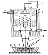 Рис. 3.1. Схема установки для ультразвуковой обработки Для возбуждения колебаний сердечника магнитострикционного преобразователя 2 служит ультразвуковой генератор (УЗГ) 1. Магнитострикционный преобразователь смонтирован в кожухе 7, сквозь который прокачивают воду для охлаждения сердечника. Упругие колебания от магнитострикционного преобразователя усиливаются концентратором 3, на конце которого закреплен инструмент 4, оптимальное значение упругих колебаний инструмента составляет 30 – 100 мкм. Заготовка 6 находится в ванне 5 с абразивной суспензией, состоящей из воды и абразивного материала. Из абразивных материалов используют карбид бора, карбид кремния и электрокорунд. Зернистость выбирают в зависимости от свойств обрабатываемого материала, требуемой точности и шероховатости обрабатываемой поверхности. Процесс обработки заключается в том, что торец инструмента, колеблющийся с ультразвуковой частотой, ударяет по зернам абразива, лежащим на необрабатываемой поверхности, которые скалывают частицы материала заготовки. Для нормальной работы зазор между торцом инструмента и обрабатываемой поверхностью должен быть постоянным, что обеспечивается автоматической регулировкой подачи инструмента. Абразивную суспензию в зону обработки подают под давлением по патрубку насосом. Ультразвуковым методом обрабатывают хрупкие твердые материалы: стекло, керамику, ферриты, ситаллы, кремний, кварц, драгоценные материалы, в том числе, алмазы, твердые сплавы, титановые сплавы, вольфрам. Этим методом получают глухие и сквозные отверстия любой формы, в поперечном сечении, канавки, пазы. Ультразвуковые методы используются в технологических целях для очистки поверхностей деталей от загрязнений, пайки алюминиевых проводов, сварки тонких проводов с проводящими пленками микросхем. Ультразвуковая очистка поверхностей деталей основана на явлении кавитации, возникающей в жидкой среде при возбуждении в ней упругих колебаний ультразвуковых частот. При прохождении волны растяжения в жидкости появляются нарушения сплошности-разрывы, в результате чего образуются микрополости (пузырьки), которые при «захлопывании» образуют ударные волны. В качестве жидкой среды используют различные органические растворители. Химическое действие органических растворителей и механическое действие ударных волн обеспечивают очистку поверхностей деталей от загрязнений, а в некоторых случаях от окалины и окислов при достаточной мощности ультразвуковых волн в жидкой среде Вопрос 63-64 В основе этого метода обработки материалов лежит процесс электроэрозии электродов из проводящих материалов при пропускании между ними импульсов электрического тока. Сущность процесса электроэрозии заключается в разрушении поверхности электродов при электрическом пробое межэлектродного промежутка как в газовой среде, так и при заполнении промежутка непроводящими жидкостями (керосином, трансформаторным маслом и т.д.), причем в последнем случае процесс электрической эрозии протекает интенсивнее. Схема электроискрового станка с генератором импульсов RC изображена на рис. 1.1. Конденсатор С, включенный в зарядный контур, заряжается через резистор R от источника тока. Когда напряжение на электродах 1 и 3, образующих разрядный контур, достигнет пробойного, то происходит разр