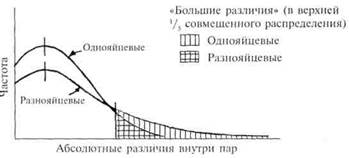 Рис. 58. Схематическая иллюстрация распределения абсолютных различий внутри пар среди однояйцевых и разнояйцевых близнецов. (Данные из Терстоуна и Стрендскова, 116.) пространственные тесты относятся к тем тестам, по результатам прохождения которых разнояйцевые близнецы больше всего отличаются от однояйцевых близнецов, — открытие, получившее подтверждение в другом исследовании, в котором использовались некоторые из тех же самых тестов (5). Как бы то ни было, особого внимания заслуживает то обстоятельство, что результаты тестирования большинства пар разнояйцевых близнецов практически ничем не отличались от результатов тестирования пар однояйцевых близнецов; различия между двумя типами близнецов касались главным образом наиболее девиантных пар разнояйцевых близнецов. Глубокое исследование этих девиантных пар может пролить свет на причины больших различий внутри пар. Выделялись ли физически эти близнецы в группе однояйцевых близнецов? Присутствовали ли в их окружении факторы, которые могли стать причинами отклонений в их развитии? Случаи психологических расстройств среди близнецов. Близнецы широко привлекались к исследованиям причин возникновения различных психологических расстройств. Обычно в этих исследованиях проводилась индивидуальная идентификация монозиготных и дизиготных близнецов, проявлявших определенные расстройства. Случаи проявления таких же расстройств среди других близнецов в тех же самых парах и среди других их родственников также исследовались. В каждой семье тот индивид, который принимал участие в исследовании и по отношению к которому определялось родство, обычно назывался индексным случаем. Еще такой индивид назывался «препозитом» и «пробан- Семейное сходство 371 дом». Если у обоих родственников, составляющих пару близнецов, братьев и сестер и т. д., обнаруживалось некое расстройство, то их начинали называть конкордантами. Если расстройство обнаруживалось только у одного из родственников, составлявших пару, то эту пару называли дискордантной. Масштабные серии исследований такого типа были проведены Каллманом и его сотрудниками в Психиатрическом институте штата Нью-Йорк (55, 57, 60). Самые интересные результаты принесло исследование шизофрении, во время которого было изучено наибольшее количество случаев. Начав с исследования 953 индексных случаев близнецов (268 монозиготных и 685 дизиготных), имевших шизофрению и проходивших лечение в клиниках штата Нью-Йорк, исследователи перешли к изучению их родственников, имевших тот же диагноз. Основные результаты исследования приведены в таблице 11. Таблица 11 Доля конкордднтов среди родственников 953 больных шизофренией в штате Нью-Йорк. (Данные от Каллмана, 57, с. 146.)