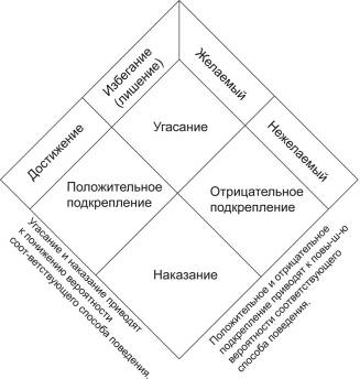 1а) Достижение желаемого результата. Положительное подкрепление. Например, кошка выскочила из клетки и захватила приманку. 2б) Избегание не желаемого результата. Отрицательное подкрепление. Например, в клетке было тесно, душно или в полу клетки пролегала сетка с электрическим током. Когда вышла из клетки избежала не желаемого. Положительное и отрицательное подкрепление приводят к повышению вероятности соответствующего способа поведения. 2а) Лишение желаемого результата. Отсутствие подкрепления, приводит к угасанию. Кошка выскочила из клетки, а приманку убрали. 1б) Получение не желаемого результата. Это наказание. Например, кошка выскочила из клетки, убрали приманку и ударили током. Угасание и наказание приводят к понижению вероятности соответствующего способа поведения.