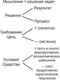 Индивидуальные особенности субъекта. Этим занимается диагност. Заранее неизвестно как связаны особенности с решением задачи. Например, подверженность групповому давлению - конформизм, отрицательно влияет на успешность решения задач. У таких людей легче вырабатываются ненужные установки. Или индивидуальная тревожность в этом смысле странный фактор. С одной стороны излишняя мотивация (вдруг не решу задачу). Но с другой – та же тревожность помогает. Такой человек заметит в объекте большее количество деталей. У такого человека выше когнитивная сложность, выраженный когнитивный стиль. В 4) квадрате можно включать факторы, повлиявшие не закономерно, а случайно. Коррелляция не свидетельствует о причинно-следственной связи. Что помогло одному может помешать другому. Мы посмотрели на процесс решения задач так сказать извне. Во втором вопросе мы попытаемся посмотреть что происходит в промежутке.