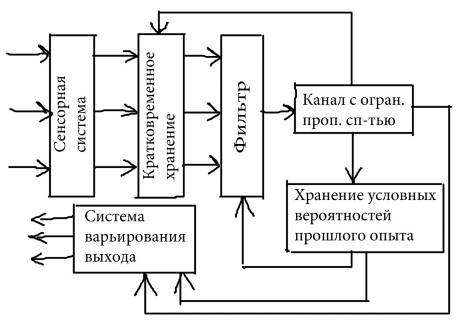 Исследовательские вопрос: какова будет стратегия отчёта испытуемого? Одна стратегия параллельная, т.е. сохраняется всё. В отчёт попадут числа попарно. Либо отчет последовательный. Если внимание – это фильтр, то отчет может быть только последовательный. Т.е. сначала пройдёт информация с одного канала, а затем возможно с другого канала. Результат. 65% справлялись с этой трудной задачей и отчитывались они только последовательно. Для параллельного отчета требовалось существенно больше времени. Пытается построить более развернутую модель. Во второй основной модели информация поступает на сенсорный вход. Помимо этого блока близкий по содержанию блок кратковременного хранения (по сути сенсорный регистр). Затем следует фильтр ранней селекции[591]. Вслед за фильтром идёт канал с ограниченной пропускной способностью. Далее блок хранения условной вероятности прошлого опыта (ХУВПО). С канала ограниченной пропускной способности передает на кратковременное хранение сигнал о готовности продолжать работу. ХУВПО влияет на фильтрующий блок. Получается два кольцевых взаимодействия. И наконец имеется система варьирования выхода, которая работает также с учетом прошлого опыта субъекта. Модель ранней селекции по А.Трейсман[592]. Её интересует то, что во втором эксперименте Черри какие-то данные со вторичного канала попадали в отчет о релевантном. Т.е. фильтр не является жестким,