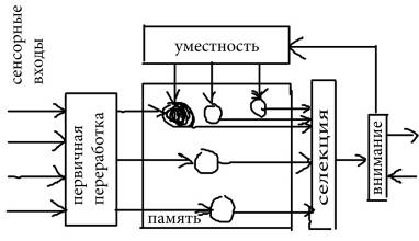 Это так называемый словарь (как скажем толковый). В блоке словаря есть ячейки, которые как-то активированы, например где-то есть высокоактивна (ячейка с собственным именем). Какое-то сообщение активирует ячейку. Как слова в словаре ячейка связана с какими-то другими. И среди них есть и такая ячейка, которая присутствует на нерелевантном канале. И тогда ослабленный сигнал попадает на подготовленное место. У Бродбенда последовательная поканальная переработка информации, жесткий фильтр работающий по физическим характеристикам. У Трейсман фильтр тоже на ранних этапах жестким уже не является. И возникает более расширенная идея о прошлом опыте как о словаре. Даже слабые в физическом отношении сигналы приводят к результату, если они связаны с содержанием сообщения по своему смыслу.