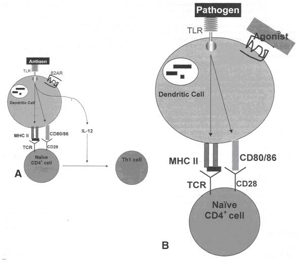 Как было описано выше, простые CD4+ Т хелперы делятся на клетки 1 и 2 типа (см. рисунок 4А). Сейчас будет произведена оценка влияния стимуляции b2АР на данный процесс. Во-первых, происходит презентация антигена на комплексах MHC II класса антиген презентирующими клетками (например, дендритными клетками). Данный процесс распознается рецептором Т клетки на простой CD4+ клетке Т хелпера. Стимуляция CD28 на простом Т хелпере молекулами CD 80/86, находящимися на антиген презентирующей клетке, приводит к выработке Ил-12 антиген продуцирующей клеткой. Ил-12 осуществляет дифференцировку простых CD4+ клеток на клетки 1 типа. Стимуляция b2АР ведет к снижению выработки Ил-12, подавляя условия, благоприятные для дифференцировки клеток 1 типа (см. рисунок 4В). Стимуляция b2АР модулирует иммунный ответ, снижая регуляцию клеточного иммунитета и повышая регуляцию гуморального иммунитета.