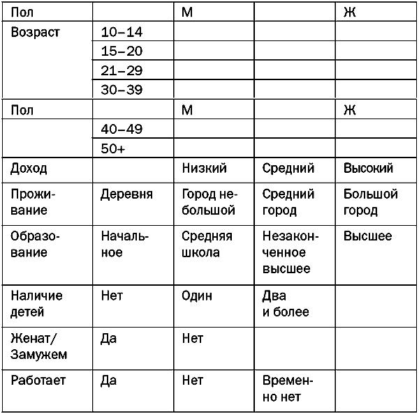 Как быть, если ваш бизнес – продажа еды на улице? Или если вы владеете сетью кинотеатров? Или предоставляете доступ к Интернету посредством карточек? То есть, казалось бы, продаете все и всем… В этом случае опишите своего потребителя с точки зрения дохода, желаний («хочу все время быть в Интернете», «хочу перекусить», «нужно убить выходные»), одежды, привычки покупать газеты и т. д. Вы ОБЯЗАНЫ знать своего потребителя в «лицо». Иначе он забудет «лицо» вашего товара! Если вы смогли описать своего покупателя, поставьте на полях еще один «плюс».
