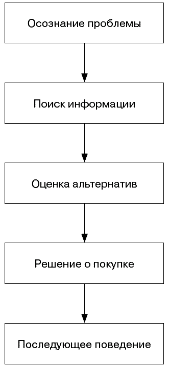 В итоге попытки объяснить с рациональной точки зрения процесс выбора и покупки товара, в который включено множество совершенно нерациональных и до конца не понятых факторов, закончились, оставив нам на память несколько более‑ менее логичных схем. Самая известная из них, наверное, в силу своей простоты и приближенности к жизни, – AIDA. По преданиям старины глубокой, AIDA сначала в виде модели «внимание – включение – понимание» была предложена в 1913 году Уолтером Дилл Скоттом (Walter Dill Scott), психологом Northwestern University. В дошедшем до нас четырехбуквенном варианте формула появилась с легкой руки некоего Стронга (E. K. Strong) в 1925 году. Отдавая дань уважения этой самой короткой и популярной в рекламе формуле, приведем «расшифровку» четырех шагов. Attention (англ. – внимание). Потребитель должен получить информацию о товаре: о том, что он существует, где находится, как работает, зачем нужен и как его получить. Interest (англ. – интерес). Потребитель должен быть стимулирован для того, чтобы проявить интерес к товару. Какими специальными характеристиками, нужными потребителю, обладает товар? Как он может удовлетворить его потребности? В ходе этой стадии потребитель вырабатывает отношение к продукту, решая, нужен ли он ему. Desire (англ. – желание). Если реакция потребителя положительная, и интерес проснулся, то на этом этапе следует создать у него желание совершить покупку. Это происходит путем соединения в воображении покупателя тех нужд, который он имеет, и преимуществ продукта. Фактически мы должны убедить потребителя, что продукт способен удовлетворить его желания и нужды. Это убеждение приводит к… Action (англ. – действие). На этом этапе покупатель встает, идет в магазин и покупает товар, т. е. совершает действие. В принципе здесь нельзя ни убавить, ни прибавить; все вроде бы так и происходит. Но люди были бы слишком просты, если бы остановились на представлении покупки как процесса из четырех шагов, поэтому позже появились более сложные модели. В 1967 году Робинсон, Фаррис и Винд[2](Robinson, Farris and Wind) предложили рассмотреть покупку как проблему, в ходе решения которой человек предпринимает следующие шаги: осознание проблемы, поиск информации, оценка альтернатив, решение о покупке, последующее поведение. Эта модель изображена на рис. 3.1.
