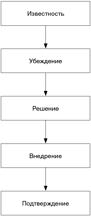Уповая на интеллект читателя, не будем объяснять каждый этап: названия говорят сами за себя. Заметим только, что на каждой из них покупателя должна сопровождать постоянная информационная поддержка. Ему можно помочь осознать проблему, дать нужную информацию, склонить на свою сторону при оценке альтернатив, убедить принять решение о покупке в пользу нашего товара и подтвердить его выбор на этапе «постпокупочного» поведения. Модель Робинсона, Фарриса и Винда может быть применена к любой покупке, тогда как новый товар резко отличается от уже существующего по схеме поведения покупателя. К старым товарам уже не нужны особенные объяснения, они должны лишь вовремя «попасться на глаза» покупателю. В отношении новых нужно еще доказать, что они достойны внимания будущего владельца. Вот почему на свет появились различные модели поведения покупателя относительно новых товаров. Одна из них была предложена Эвереттом Роджерсом[3](Everett Rogers) в 1962 году для инноваций вообще и предполагала следующие этапы: известность, убеждение, решение, внедрение, подтверждение (рис. 3.2).