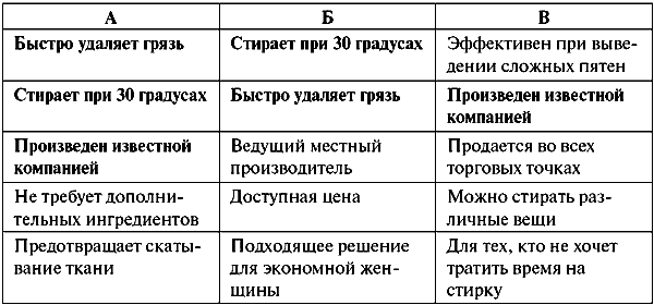 Таблица 10.3. Описательные модели «колес» трех брендов стиральных порошков