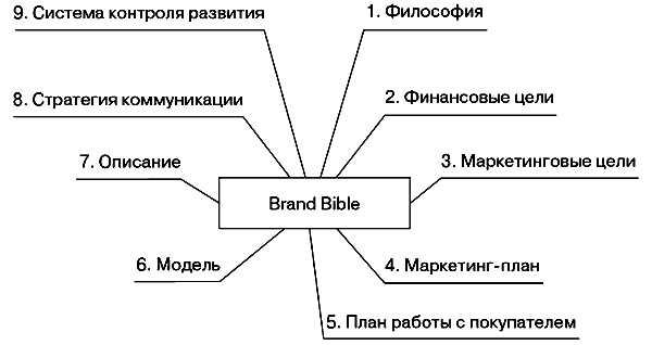 В начале книги мы говорили о том, что компании страдают так называемым «разрозненным знанием»: все отвечающие за создание нового бренда сотрудники что‑ нибудь знают, но нет никого, кто бы знал все. Это наблюдение справедливо не только для начала проекта по созданию бренда, но и для его окончания. После того как были проведены масштабные исследования, неймеры разработали имя, маркетологи опре делили целевую аудиторию и описали все элементы будущего хита, а дизайнеры облекли его в сверхпривлекательные «одежды», может оказаться так, что не существует единого документа о бренде. Понятие Brand Bible используется специалистами редко. Мы ввели его в свою практику, чтобы противопоставить общеизвестному Brand Book. Как правило, большинство компаний под «Книгой бренда» понимает сборник графических стандартов, которые описывают все визуальные элементы бренда от упаковки и логотипа (минимальный набор brand book) до оформления точек продажи и внешнего вида продавцов (оптимальный). Существуют «бренд‑ буки», содержащие сотни страниц только одних указаний по размещению логотипа на тех или иных объектах (например, в General Electric). Однако сегодня даже неспециалистам в маркетинге стало очевидно, что такой «графической» информации недостаточно для работы. Нужно иметь под рукой сведенные в единый документ полные сведения о бренде. Маркетолог, продавец, линейный сотрудник любого отдела должен в любую минуту получить информацию о том, что такое бренд, зачем он нужен, кто его потребляет и т. д. Информация о бренде должна быть инструментом завоевания потребителя, а не тайной за семью печатями. Исходя из этих соображений, мы предлагаем взять на вооружение термин Brand Bible. В этом документе должна быть собрана вся информация, которая помогает работать с брендом: от описания целевой аудитории до правил расположения товара на полке. Каждая компания, создавая свою «Библию бренда» должна определиться с ее наполнением: конечно, все, касающееся бренда, описать невозможно, однако есть информация, без которой этот «фолиант» просто бесполезен. На рисунке 14.1 представлена информация о том, что, по нашему мнению, должно входить в финальный документ, сопровождающий бренд. Как видно, он охватывает все стороны существования бренда: от описания его миссии для сотрудников и владельцев через план воздействия на покупателей и до системы контроля за развитием бренда.