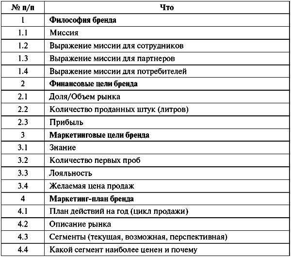 Бывают ситуации, когда никаких документов по описанию бренда создавать вообще не нужно: если вместе работают единомышленники и одна фраза (любая, описывающая бренд достаточным для них образом) является альфой и омегой бренда. В этом случае все будет идти хорошо, пока эта группа едина и монолитна и не впускает в свое «тело» людей со стороны. К сожалению, для организаторов бизнеса рано или поздно приходится нанимать на работу людей, которые могут поколебать его устои. Ведь трудно, практически невозможно заставить верить в одно и то же тысячи людей, работающих на разных предприятиях в разных концах страны… То, что очевидно создателям и «воплотителям» бренда, не совсем понятно пришедшим «с холода». Они будут сомневаться, пытаться «улучшить» или отрицать все сделанное до них. В таком случае без «Библии», в которую нужно верить только «потому, что это так», никак не обойтись. Этот документ должен просто и быстро объяснить людям, «почему это так» и не подлежит изменениям. Психологи утверждают, что большинство принимаемых на работу людей склонны максимально доверять документам, с которыми их ознакомили до приема или в начале работы как с тем, «чем надо руководствоваться». Поэтому в идеале ваши новые сотрудники должны получать свой личный экземпляр «Библии» при приеме на работу. Тогда «плоть и кровь» бренда будут для них священны. В таблице 14.1 приведены некоторые основные пункты, которые мы рекомендуем отражать в «Библии бренда». Вы можете не брать во внимание одни из них, а другие – расширить. Некоторые элементы должны оставаться неизменными продолжительное время (визуальные константы), а некоторые могут и даже должны меняться каждый год (сезон): например, стратегия коммуникации. Вам, и только вам, решать, что именно должно быть отражено в основном документе вашего бренда. Но не забудьте, что он обязательно должен присутствовать. Иначе будет туго…