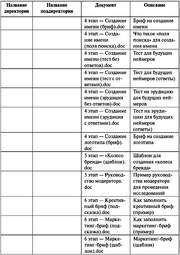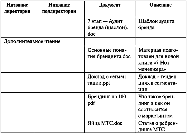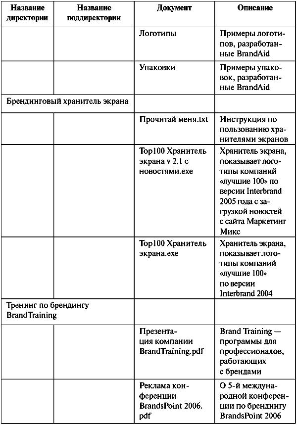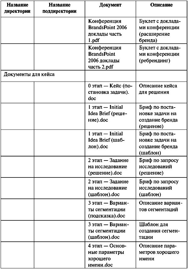 На диске, который прилагается к данной книге, [36]вы найдете много полезной информации по брендингу. Во‑ первых, материалы по кейсу – все брифы, как шаблоны, так и заполненные с «подсказками». Во‑ вторых, статьи и презентации, которые помогут вас лучше ориентироваться в теме. В‑ третьих… Посмотрите сами. Уверены, вам будет интересно! Содержание диска представлено в табл. П15.